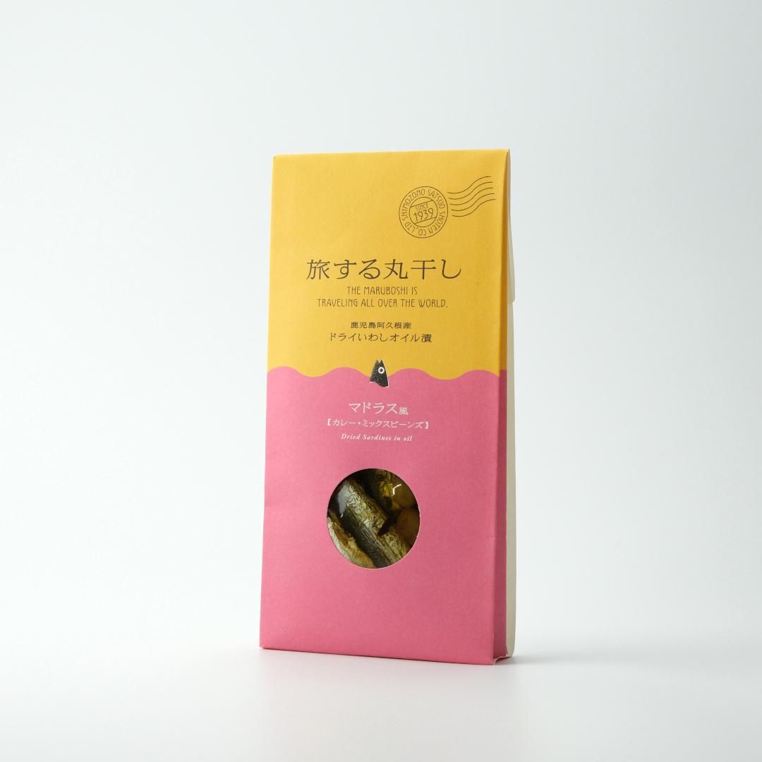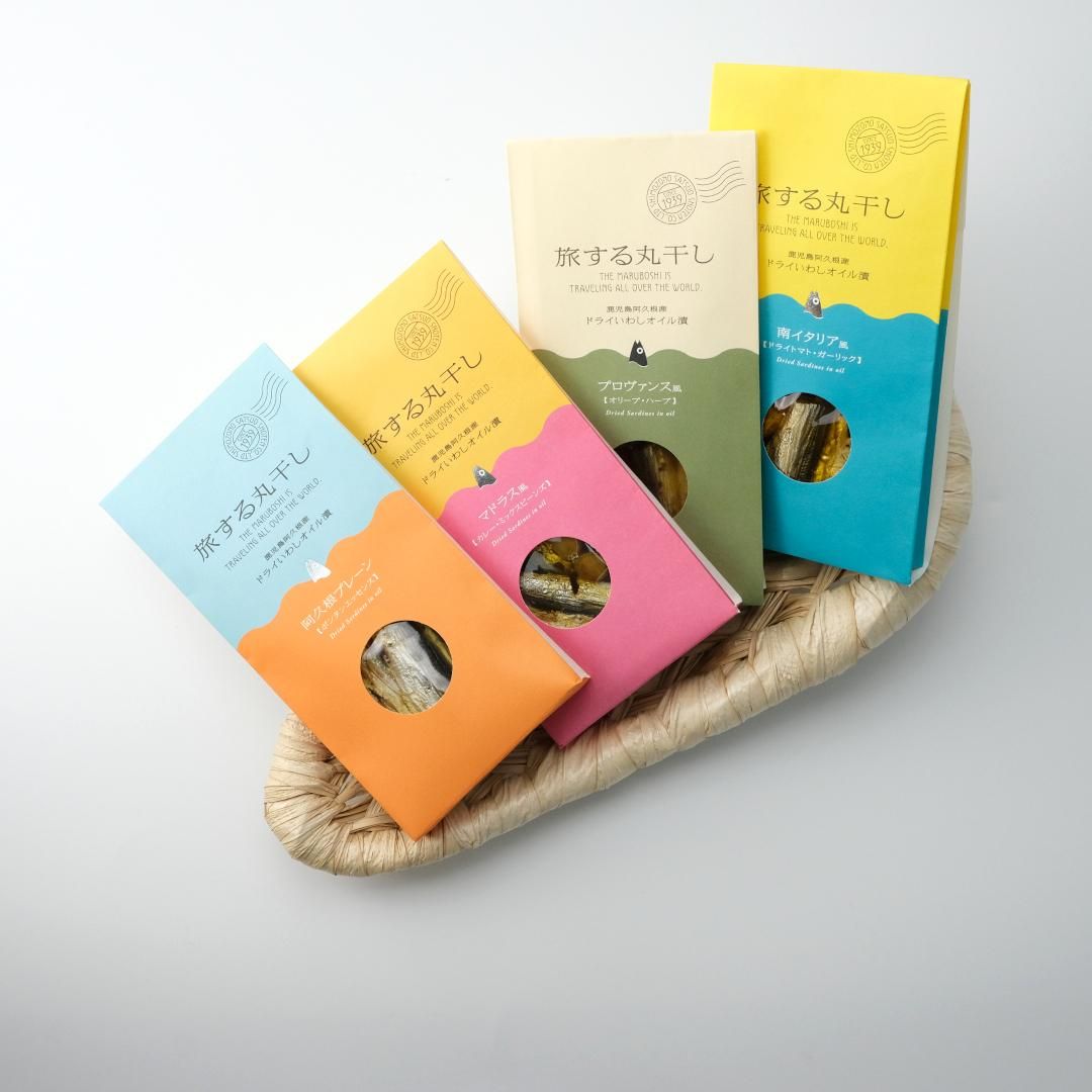 老舗の干物屋が数多く残る町、鹿児島県阿久根市。この港町で作られた「ウルメイワシ」の丸干しが、世界の国々の味をイメージしたオイルで漬けられています。