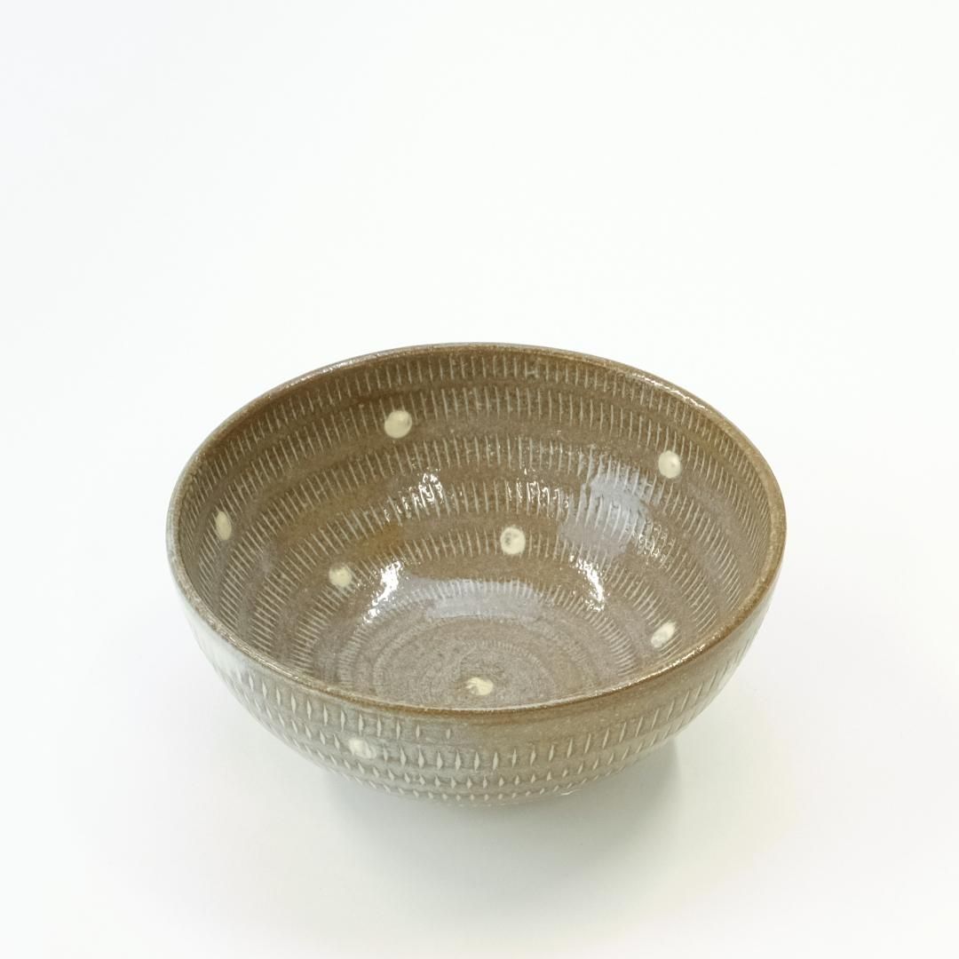 福岡県小石原の山あいで、現代の暮らしにあう器を作り続ける「翁明窯元」。伝統のとびかんなをベースに、内外に愛らしい小さなドット模様をほどこした飯碗です。