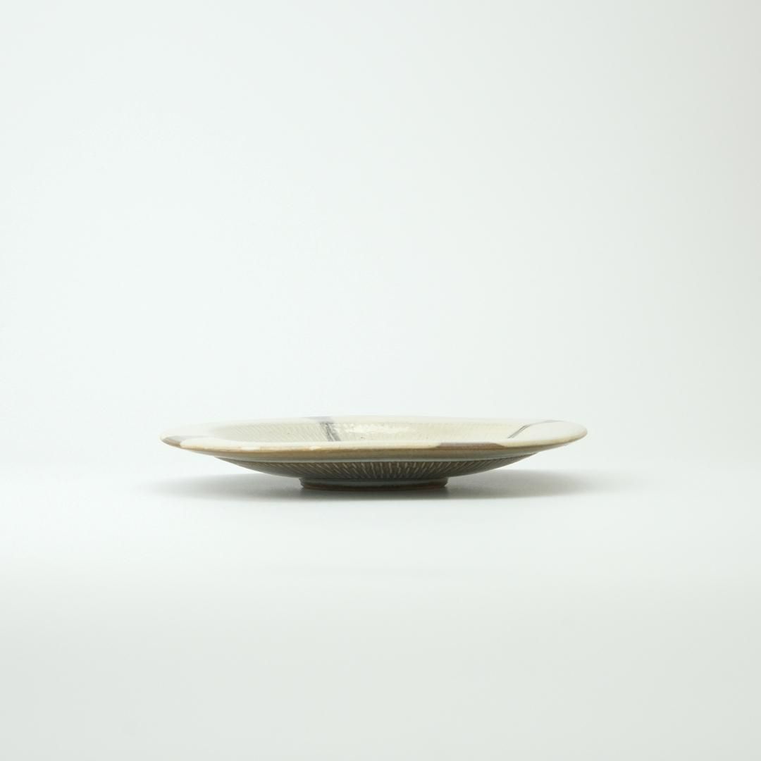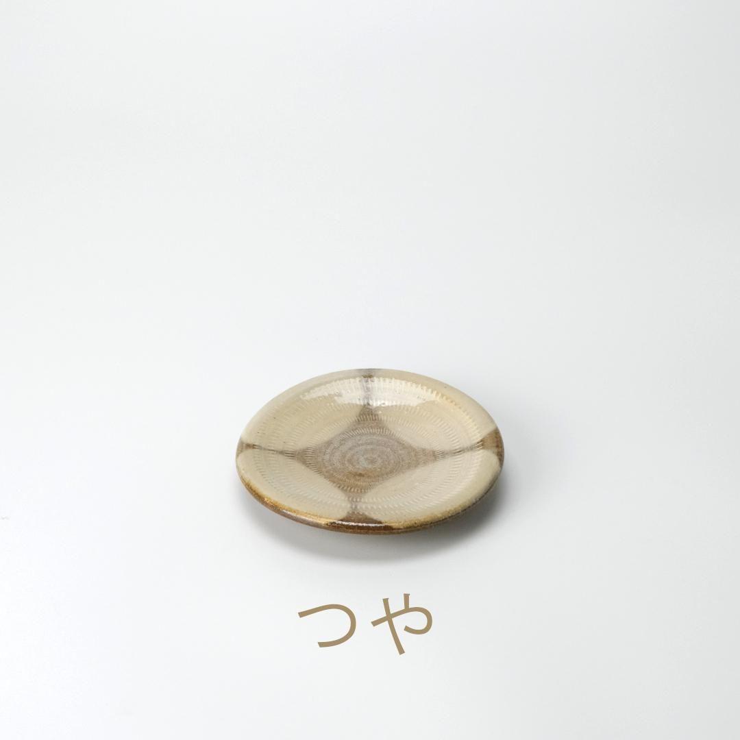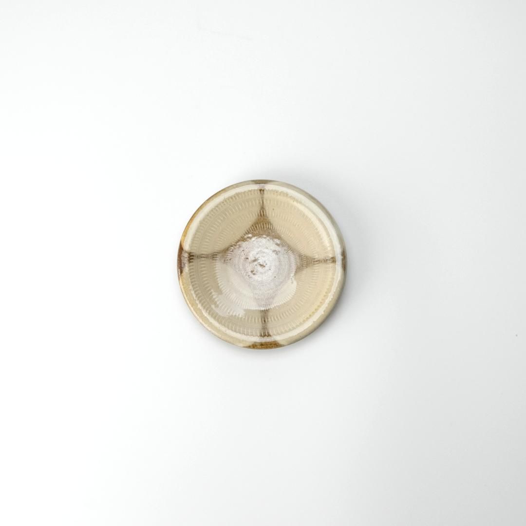 福岡県小石原の山あいで、現代の暮らしにあう器を作り続ける「翁明窯元」。今にも動き出しそうな白化粧は愛嬌たっぷりのまるい豆皿です。