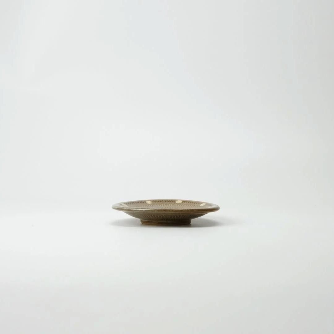 福岡県小石原の山あいで、現代の暮らしにあう器を作り続ける「翁明窯元」。小さなドットが可愛らしい、まるい豆皿です。
