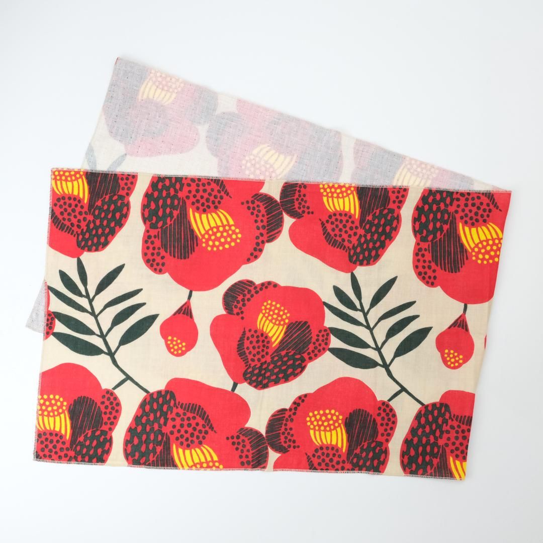 makumoとは、音も形もわからない古い古い管楽器の名前。どんな形でどんな音色なのか、想像する“わくわく感”が名付けの由来です。賑やかなデザインの線と色の不思議な布たちは、日々の暮らしに楽しさを与えてくれる一枚です。