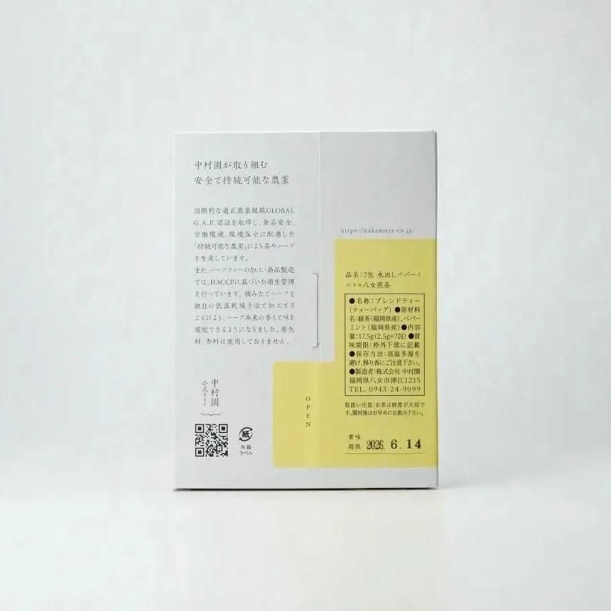 福岡県八女市の自社管理農地でハーブや茶を栽培・生産し、製造・加工している中村園。渋みを抑えた八女茶と爽やかなペパーミントを冷水でゆっくり丁寧に抽出する水出しブレンドティーです。