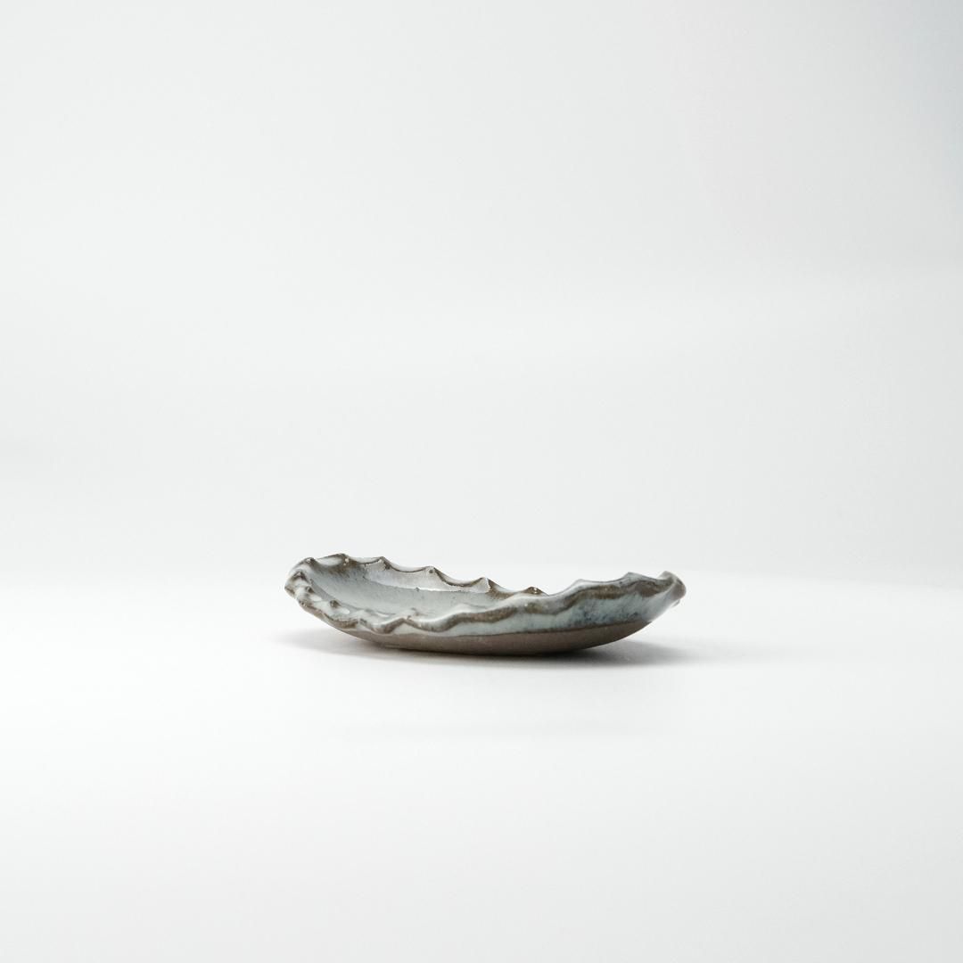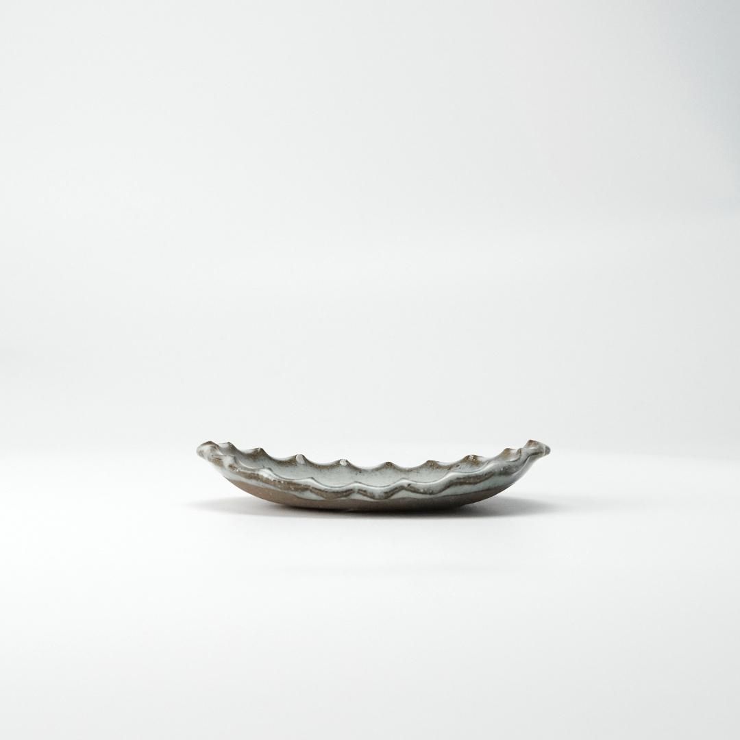 伝統を守りながらも、自由な器を作りつづける福田るいさんの小代焼瑞穂窯。フリルの縁がエレガントさを醸し出す、楕円型の小皿です。