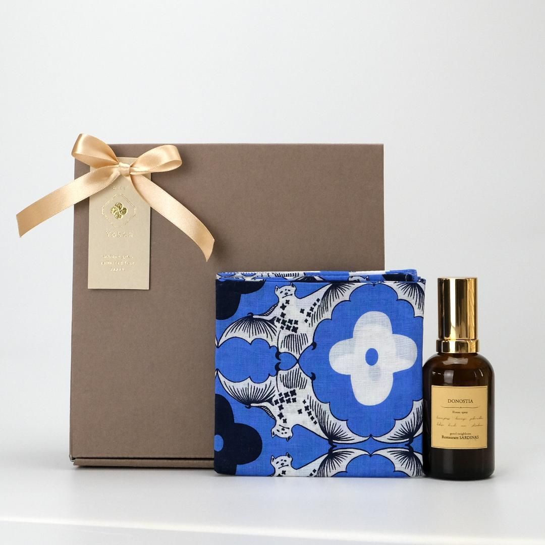 レモングラスのさわやかな香りが広がるルームスプレーと、程よいハリ感のある綿ブロードのハンカチをセットにしました。