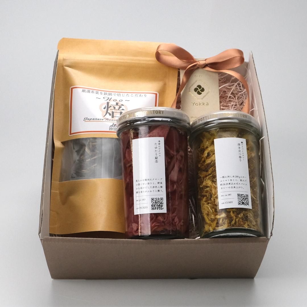 スパイスカレーの素 × 1 / 季節のピクルス(紫:たゆたう疑念 )× 1 / あまたまほうじ茶 × 1 / ギフトボックス(小)