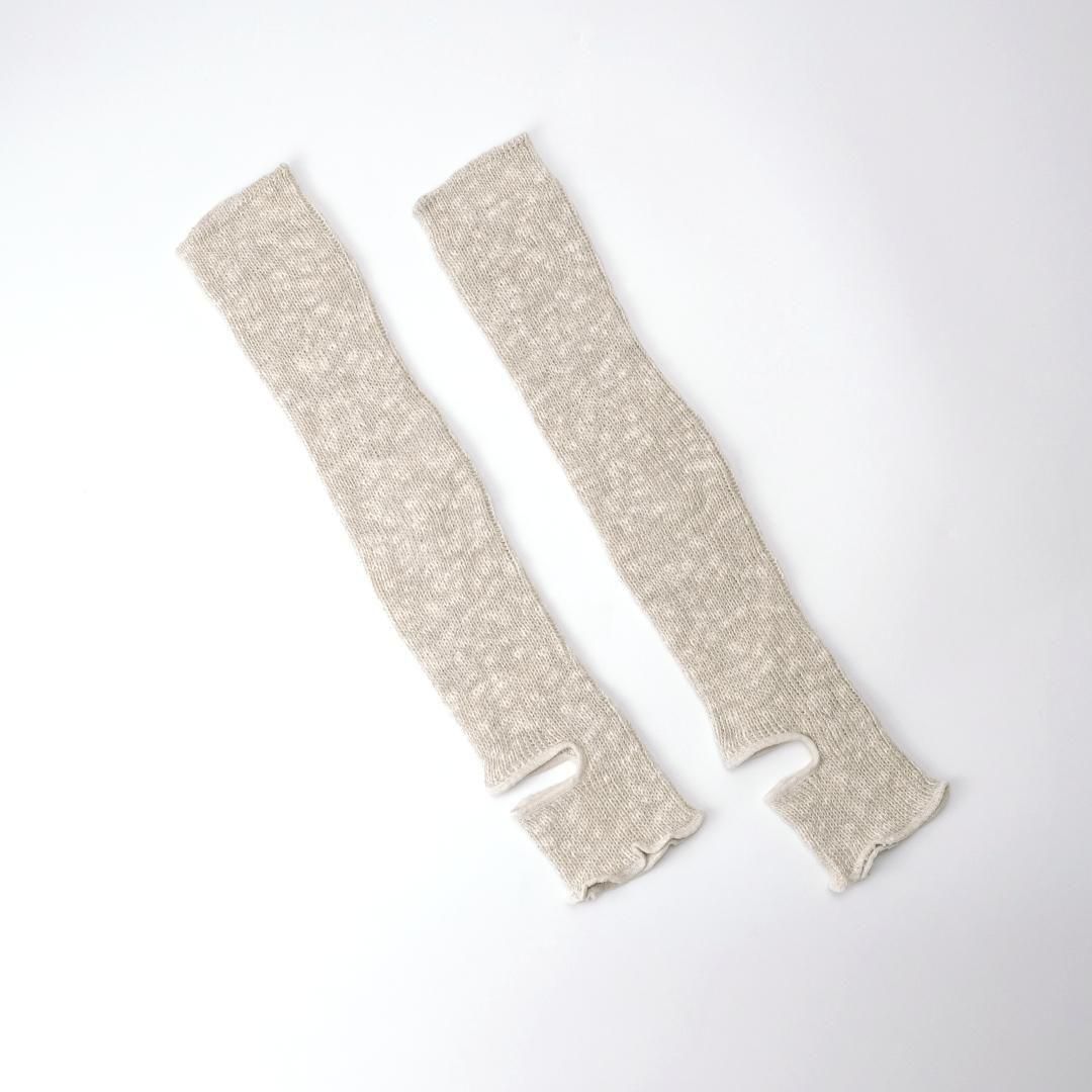 夏の紫外線対策に、オーガニックコットンで肌触り優しく心地良いアームカバーと、かかとあきウォーマーのセット。かかとあきウォーマーはトング型のサンダルでも履くことができるフィンガーレスタイプ。