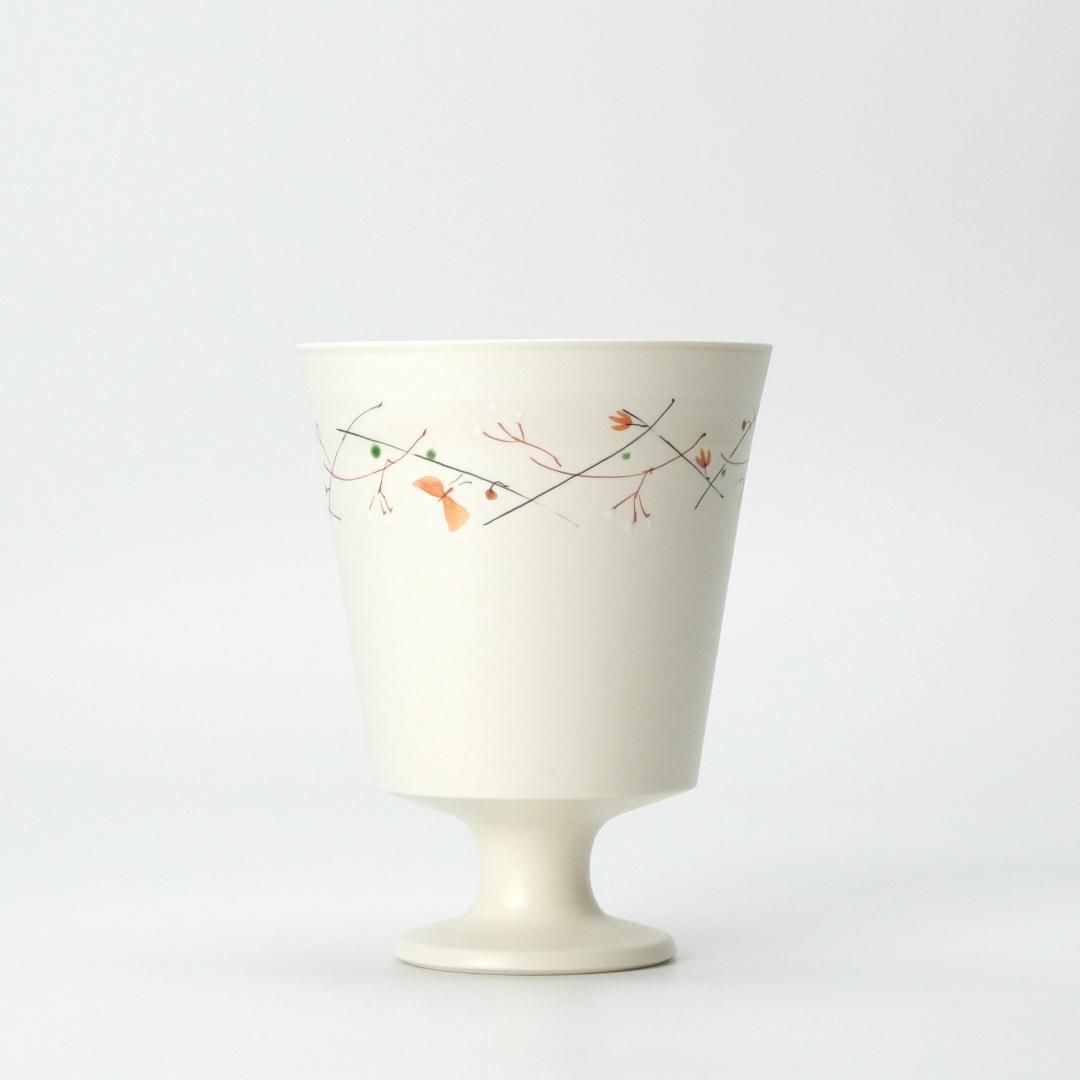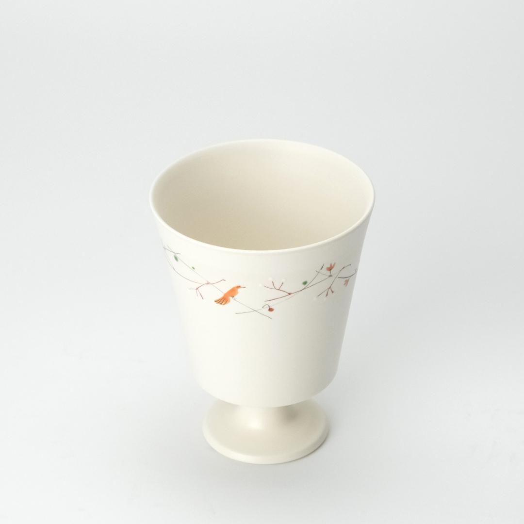 毎日の食卓がほんの少し楽しみになる器 「 studio wani 」WREATH(リース)シリーズ。ゴブレットを囲むように、草花や鳥がリースのように描かれ、上品で優しい雰囲気に仕上がっています。